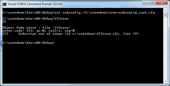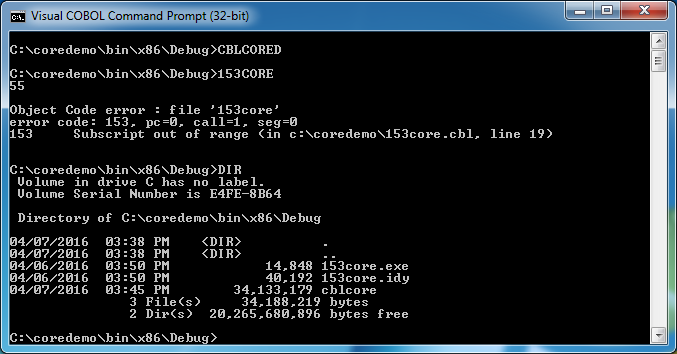 When the program fails, a core dump file CBLCORE will be created in the same folder as the application: