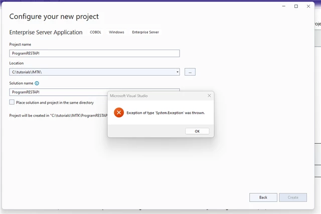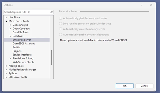 thank you very much for your help. I wanted to create an Enterprise Server Application in Visual Studio in order to install a sample application from the Microfocus Samples. After filling out the form, I pressed the Create button and a System.Exception was thrown. Among the options for Microfocus Tools I found the entry "Enterprise Server" with some options that were not available. The entries concluded with the sentence: "These options are not available for this variant of Visual Cobol". Therefore, my guess was that the Enterprise Server is not available for Personal Addition. Or perhaps the Enterprise Server is not installed or activated. Maybe you can help me here. That would be great.