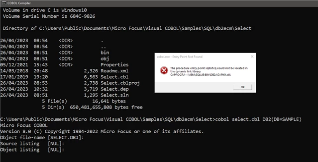 C:\\Users\\Public\\Documents\\Micro Focus\\Visual COBOL\\Samples\\SQL\\db2ecm\\Select\\Select.cbl (77,25-33) : error COBCH0012 : Operand sqlerrmc is not declared