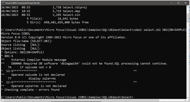 C:\\Users\\Public\\Documents\\Micro Focus\\Visual COBOL\\Samples\\SQL\\db2ecm\\Select\\Select.cbl (74,15-22) : error COBCH0012 : Operand sqlcode is not declared