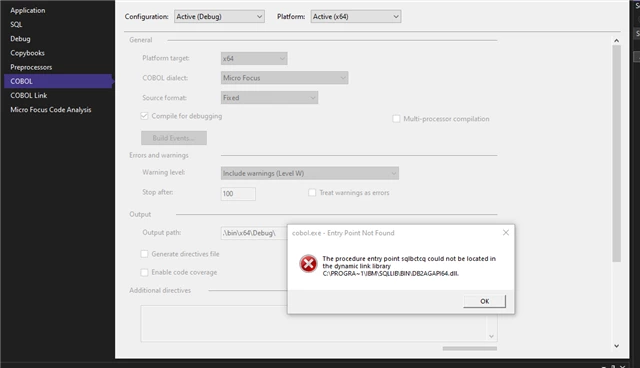 Mine looks the same as yours on the COBOL tab. The only property I changed was the configuration to be x64. The rest are the default settings for the sample 'select'. I have never experienced that error before, nor do I find any reference to it. Can you please try to compile one of the other DB2 samples like the connect one? I just want to see whether the error is specifc to this project or it is a general problem with VS2022.