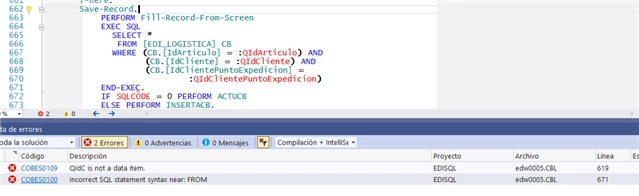 El proyecto en NE funciona correctamente y se compila sin errores, pero cuando lo importo desde VS2019, Archivo,Nuevo,Import NetExpres projet, parece que la importacion la realiza correctamente, pero cuando compilo la solucion por primera vez, en alguno de los programas CBL del proyecto, genera algunos errores en la linea END-EXEC.
