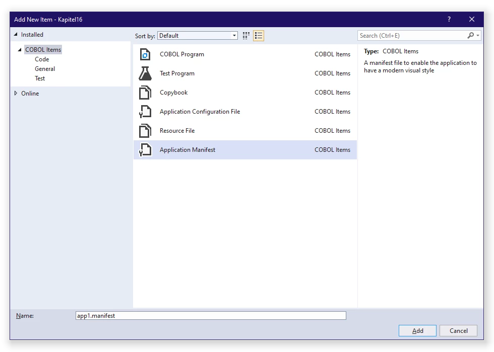 Please add a plain, empty text file item to the list of items to add to a COBOL project.
