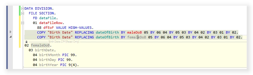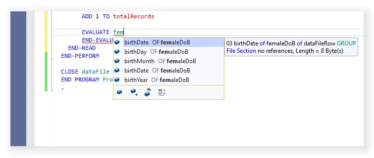 COBOL IntelliSense should also provide suggestions for node data items: