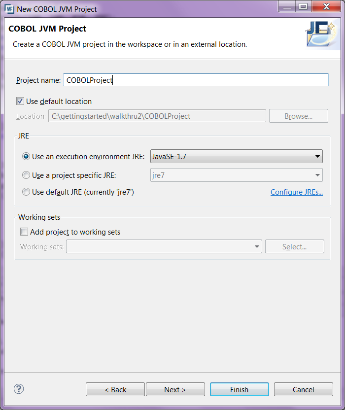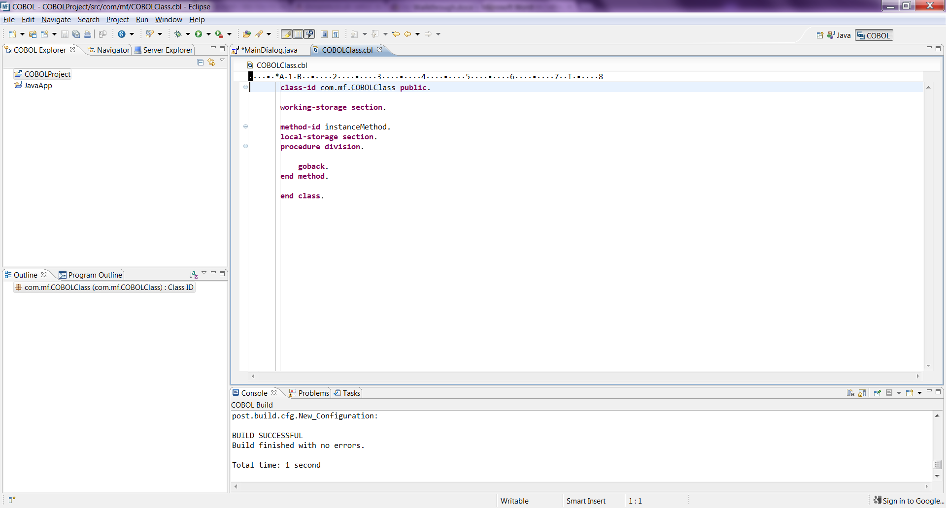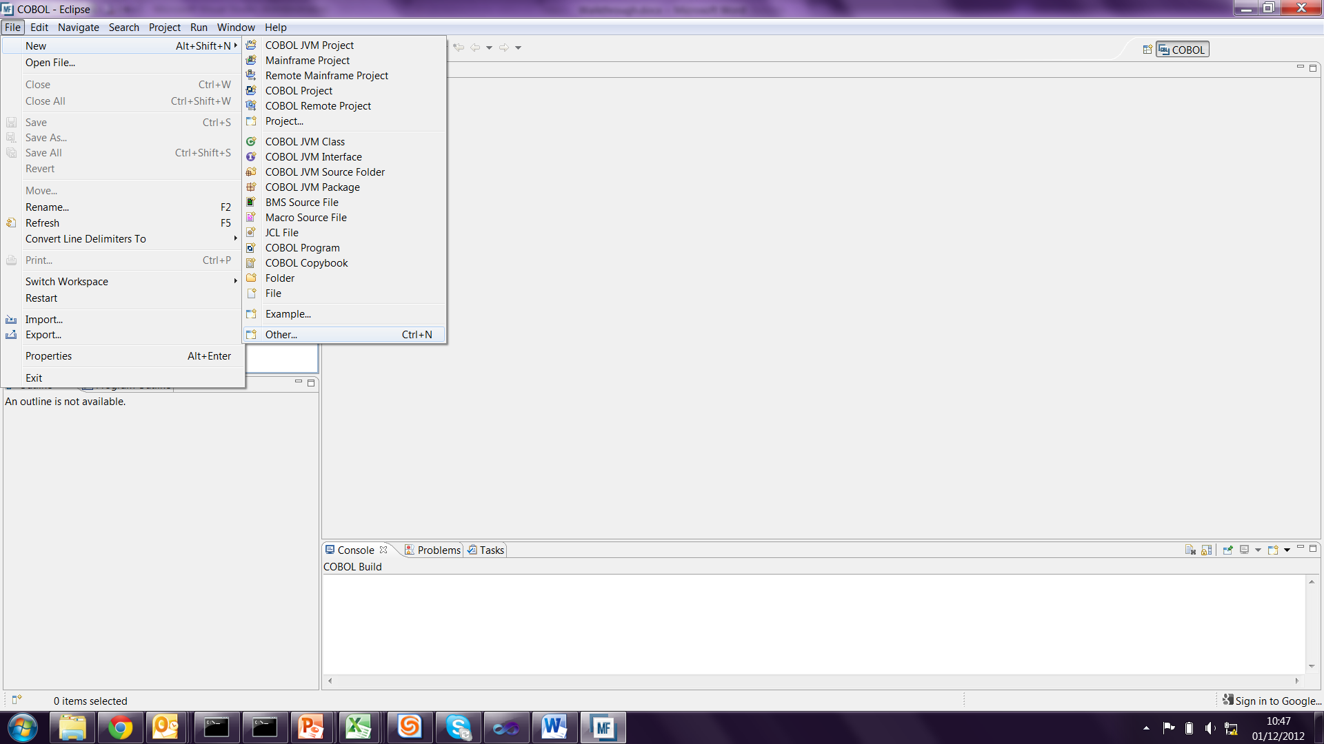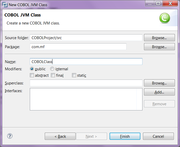 From the File new menu, click other and type COBOL JVM class and fill in these details, don’t forget the namespace