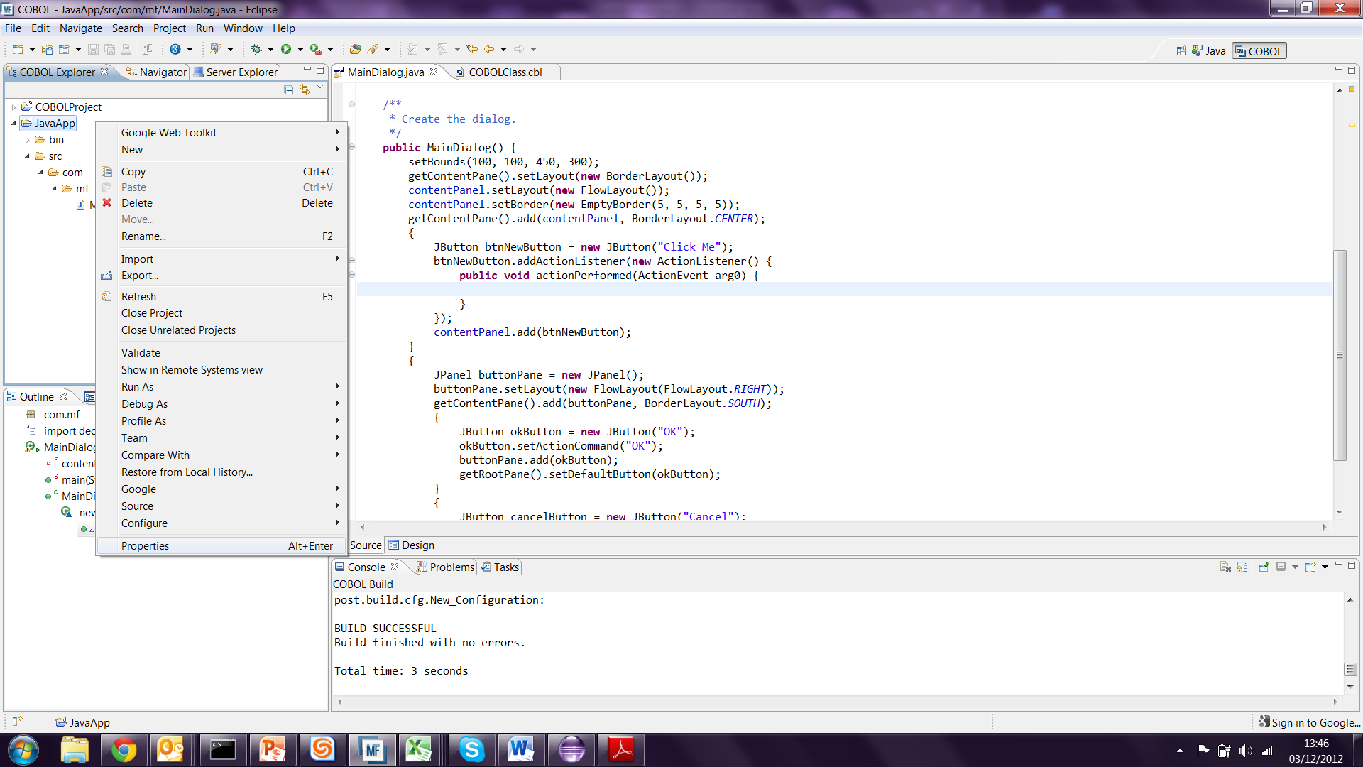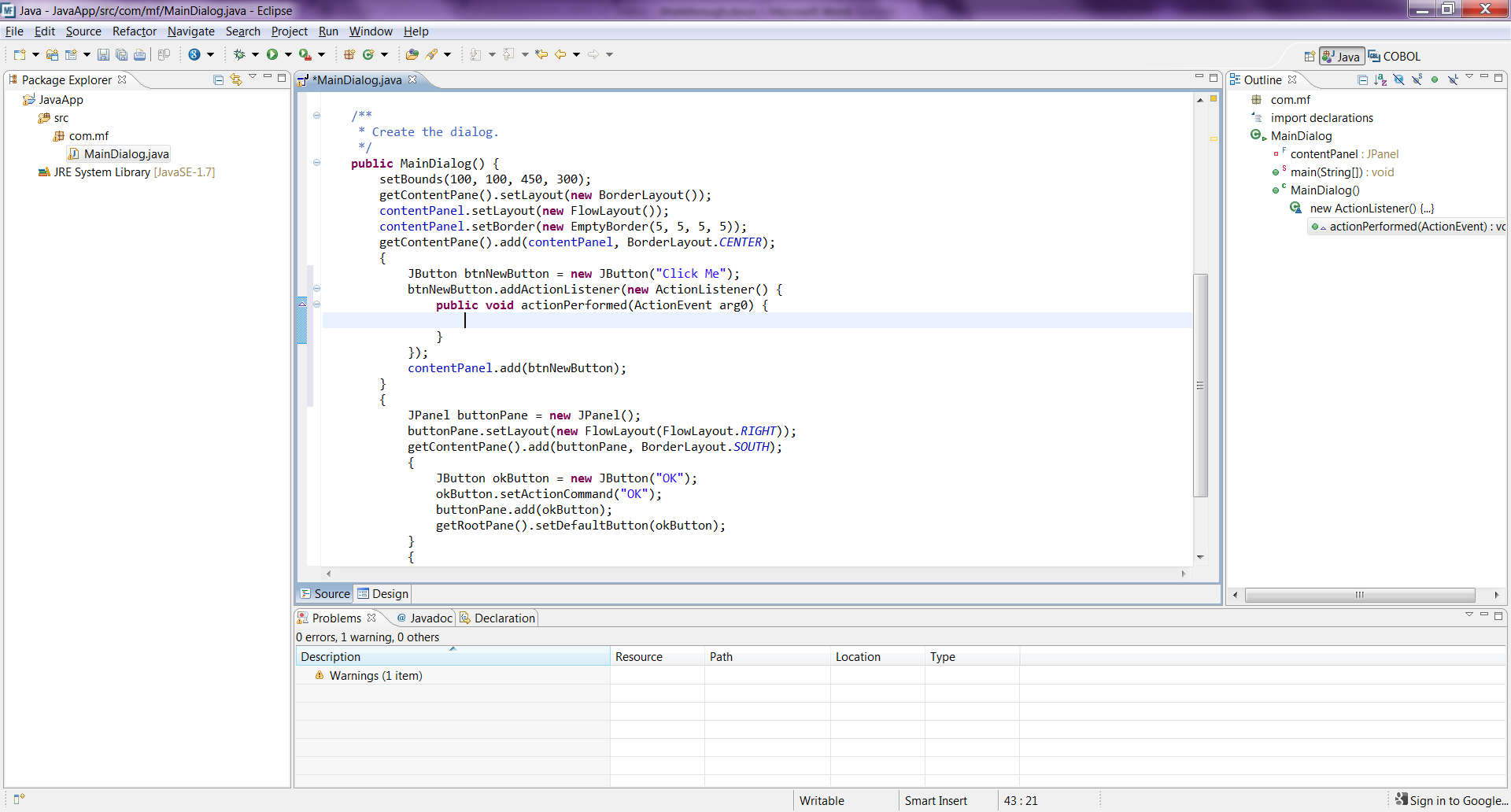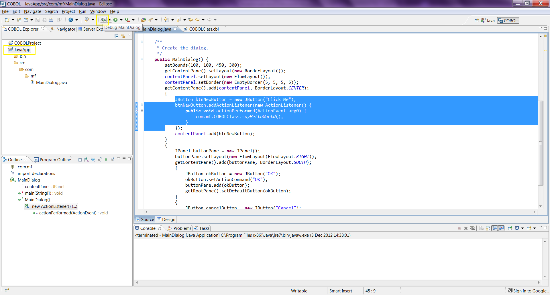The actionPerformed method gets called every time the button is invoked. We’re going to call a COBOL from this method but before we do that, we need to create a COBOL project