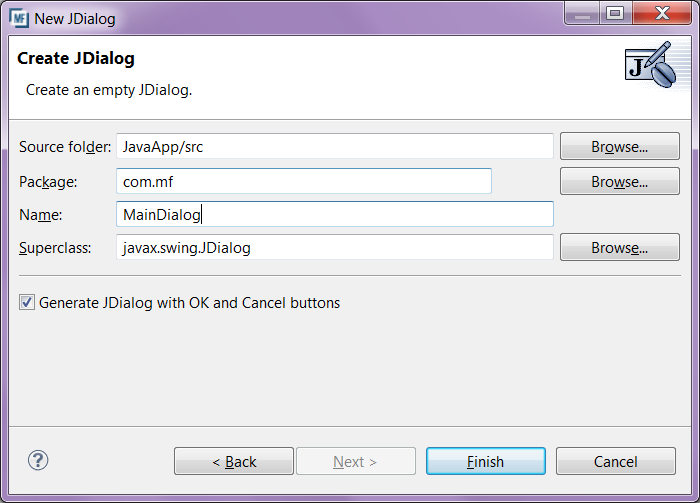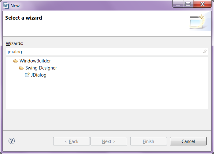 From File New Menu select other, type JDialog and click next. If JDialog isn’t available, check you have correctly installed Google Window Builder