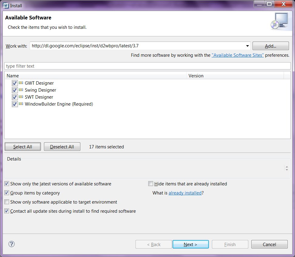 Add the following URL for Eclipse 3.7 Window Builder support to the Work With field – you don’t need to click Add.