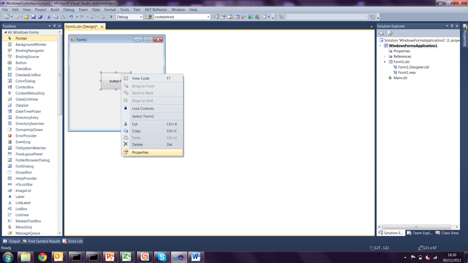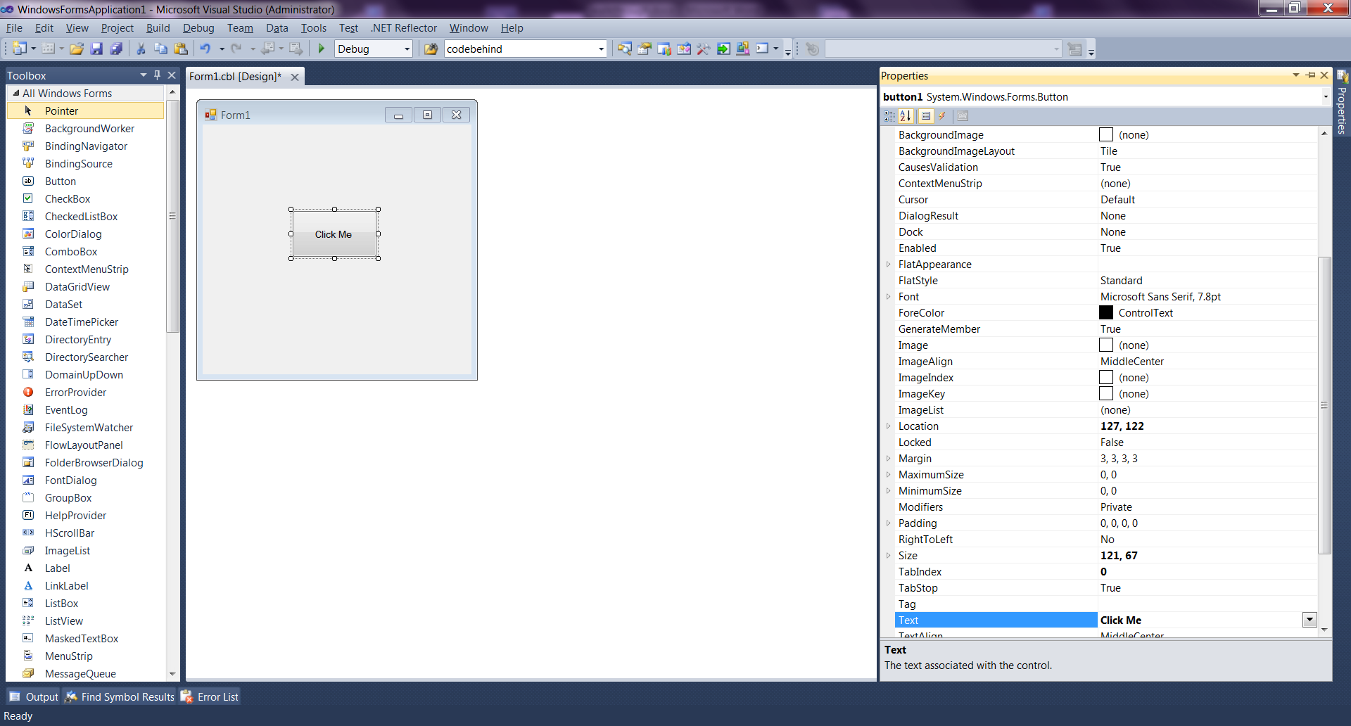 In the properties window, change the value of the button’s Text property to “Click Me”.