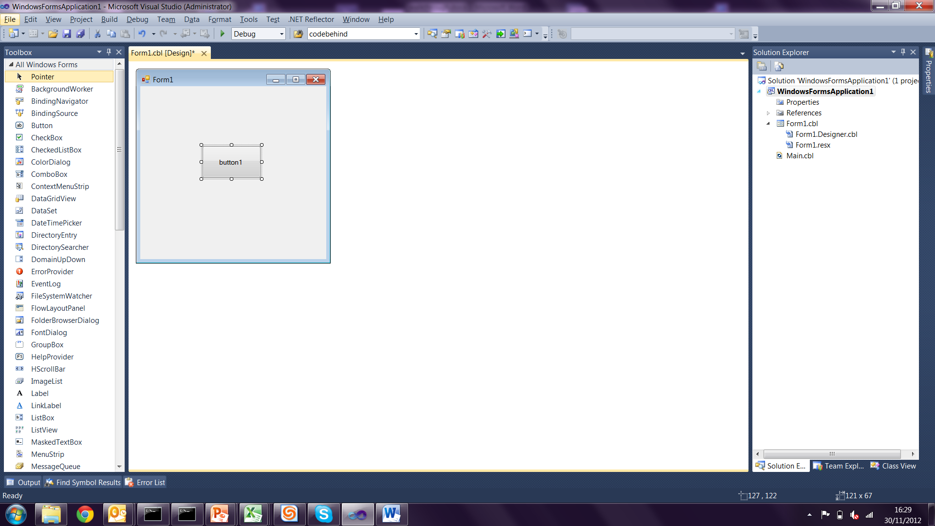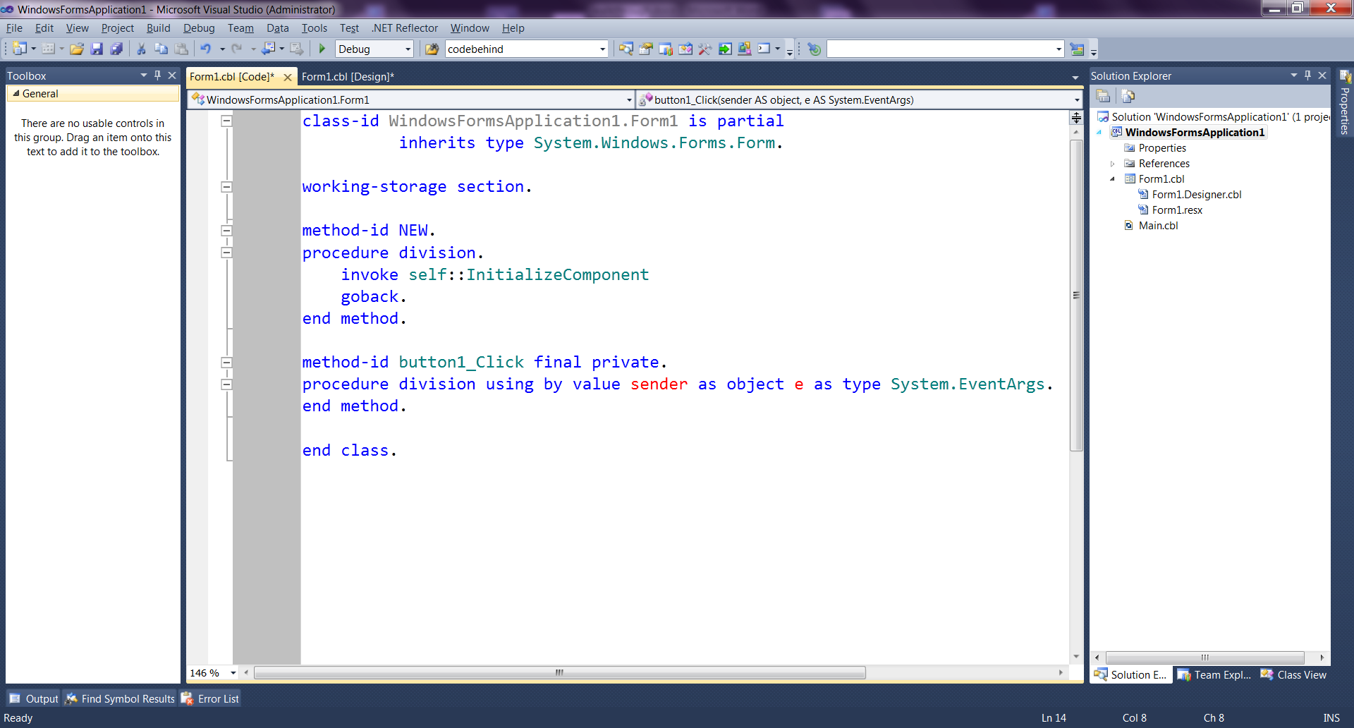 This is object oriented COBOL and the buton1_click method will get invoked every time the button is clicked. We could call an existing procedural COBOL program from this point but we’re just going to display a message box.