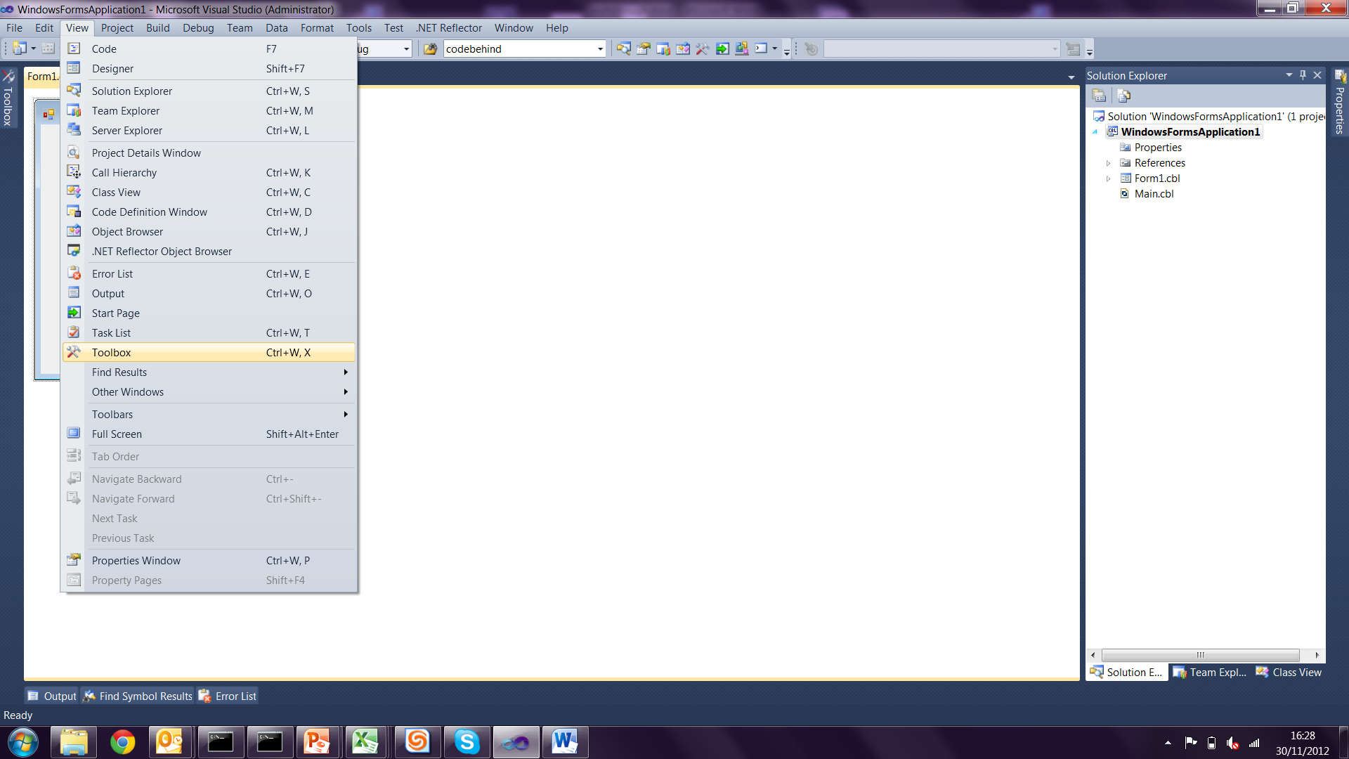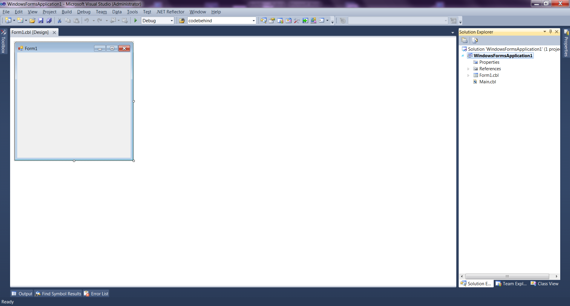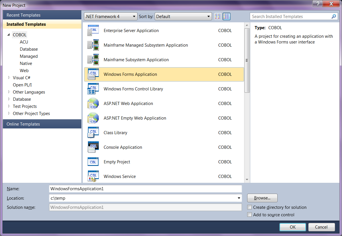 Make sure the COBOL section is selected and from there choose Windows Forms Application
