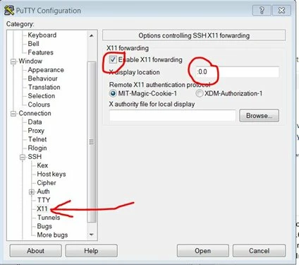 In the PuTTY configuration left panel click Connection->SSH->X11