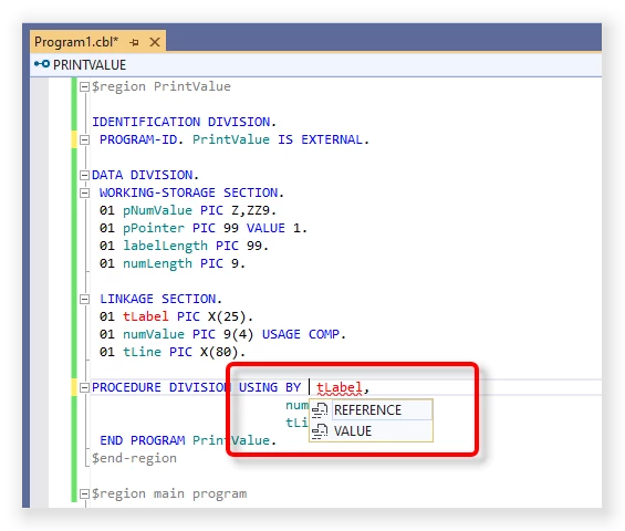 If I use BY VALUE instead (as suggested by COBOL IntelliSense) the JIT COBOL compiler returns errors, too: