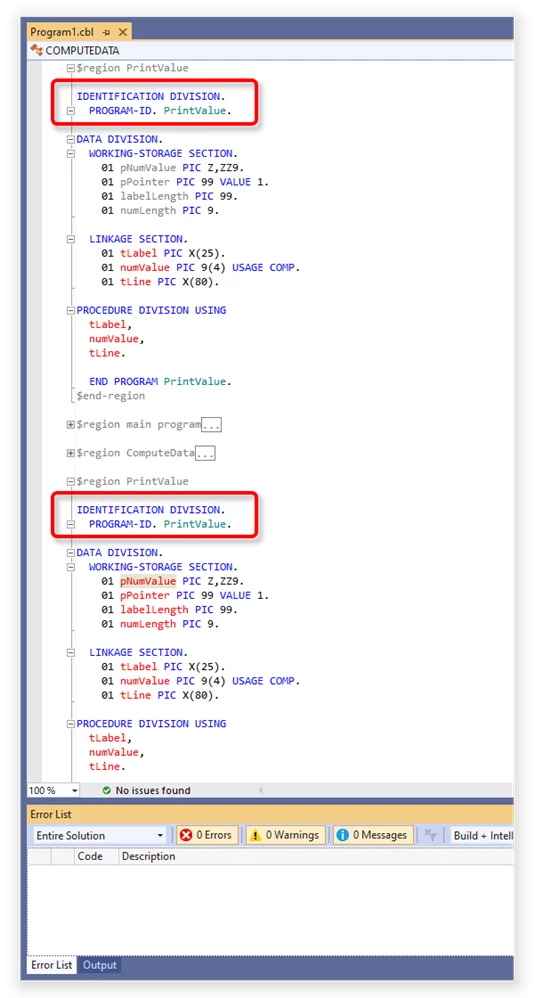As I said in my previous reply I simply moved the code in $region PrintValue below the code for Program1. I did not uncomment anything or create any prototypes. That worked for me.