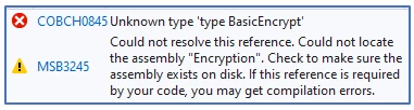 Error COBCH0845 Unknown type 'type BasicEncrypt' … and Warning MSB3245 should not occur.