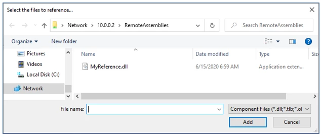I have a third-party assembly that is stored on a network drive. If I add a reference and browse to the location using UNC e.g. \\\\RemoteAssemblies\\MyReference.dll, the following errors occur :