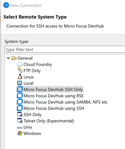 1. Create a new Connection of type "Micro Focus DevHub SSH Only" in the Remote Systems Explorer Perspective in Eclipse - Window->Perspective->Open Perspective->Remote System Explorer (I believe you already have a remote connection, just including this for completeness.) Also, you could instead create the connection as part of creating the Remote Project below, but this is the path I took…