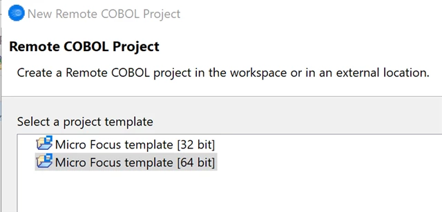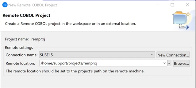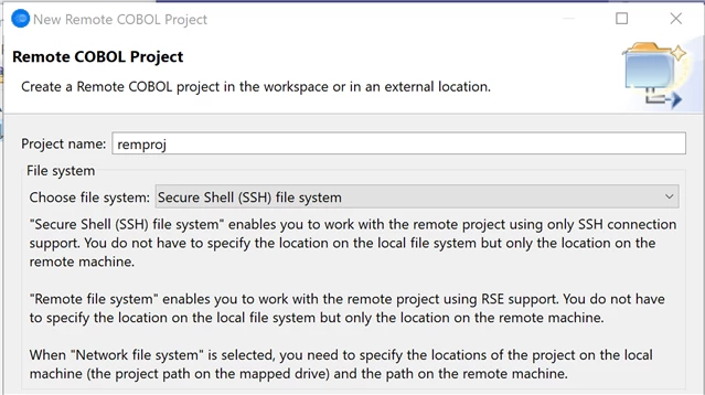 5. Create a new Remote COBOL Project, entering a project name, and choosing Secure Shell (SSH) for the file system: