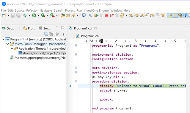 Happy to share some steps to debug a simple program when using an "SSH Only" Connection Type as you mentioned. For what it's worth, I've verified these steps with Visual COBOL for Eclipse 7.0 Patch Update 12 on Windows, connecting to Visual COBOL Development Hub 7.0 Patch Update 12 on SLES 15, and will include a few screen shots for reference.