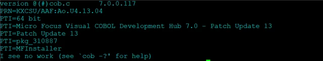 Also, can you let us know the version details for the Dev Hub installation on Linux SLES 15? Please share the complete output of the following, in a command line session where the environment (COBDIR, PATH, LD_LIBRARY_PATH) has been set for running COBOL. The V in the command is upper case: