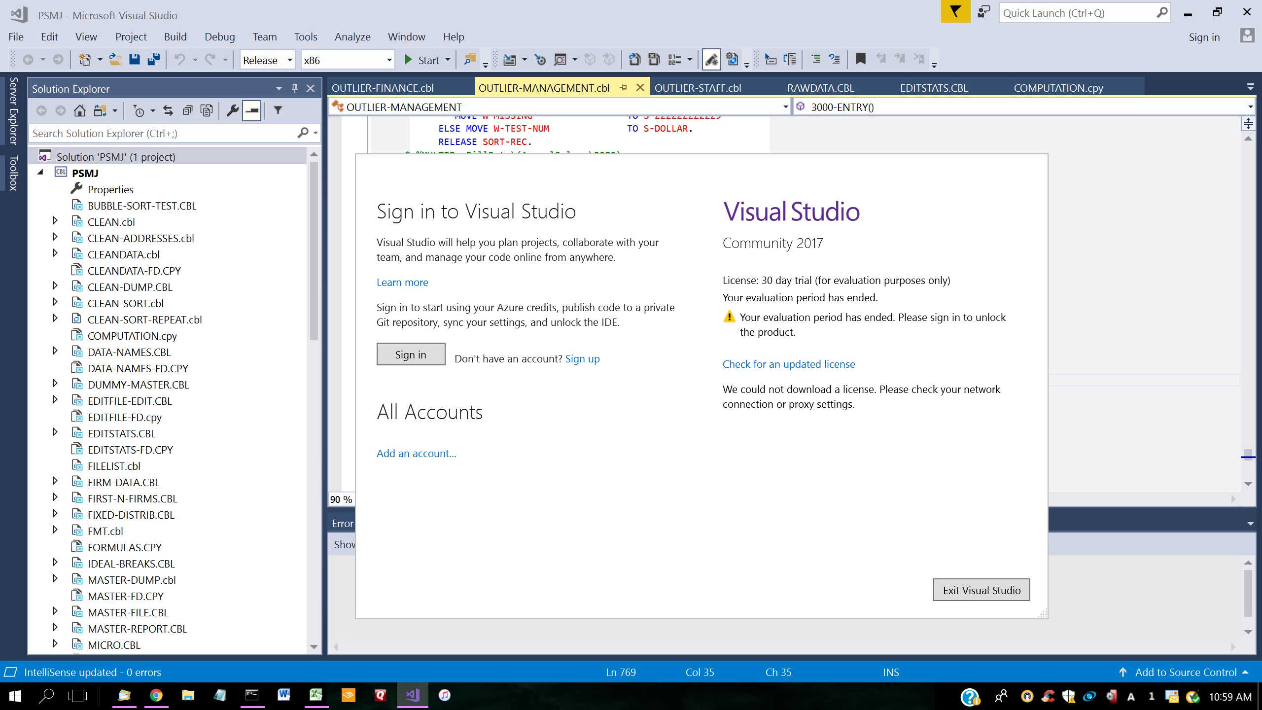 About a month ago I got a full upgrade of my Visual Studio and Visual COBOL, with help from Mark Buchanan. Today Visual Studio told me my license was only for a 30-day evaluation period. See screen shot. What do I do now?