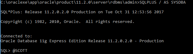 Having successfully logged on, the SCOTT.SQL script needs to be run as follows: