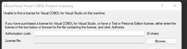 I know my way around visual studio. I am trying to learn Micro Focus Cobol(Already know Cobol) when I bring up an example solution I get the following.. Where do I find the licesnce code for the Visual Studio Cobol trial.