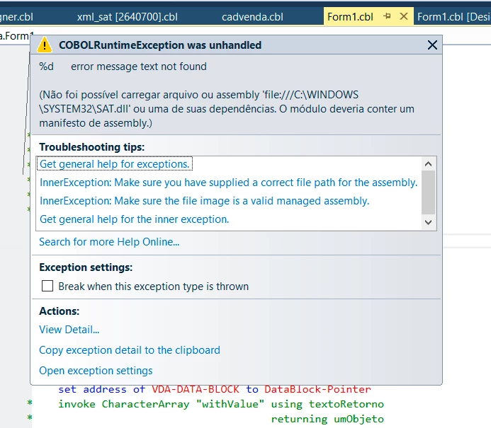 I put the image of the error, but my Visual Studio is in Portuguese: www.mmsis.com.br/images/Erro_SAT.png