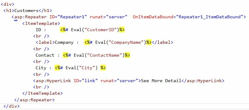 The following is an example that shows the repeater control on an ASP.NET form and the code behind to implement it. The Repeater control is wired up to the OnItemDataBound event to modify the content of each entry to add a hyperlink using the ID of a customer row in the Northwind Customer database.