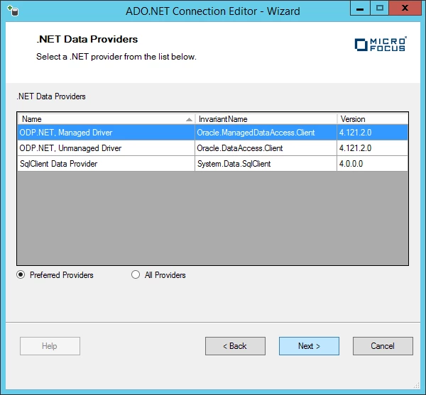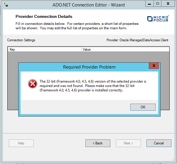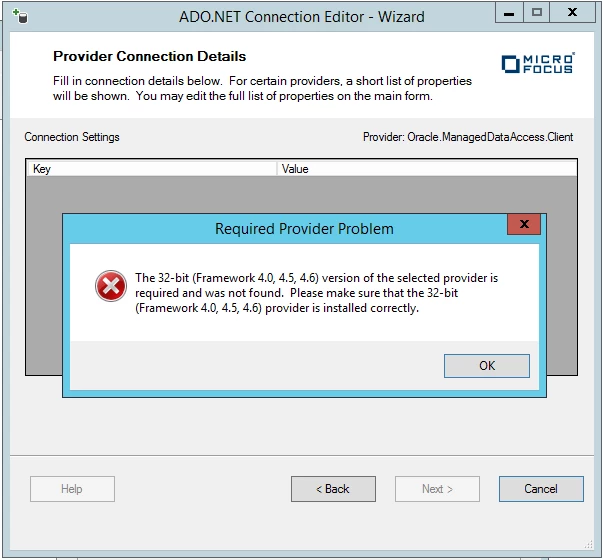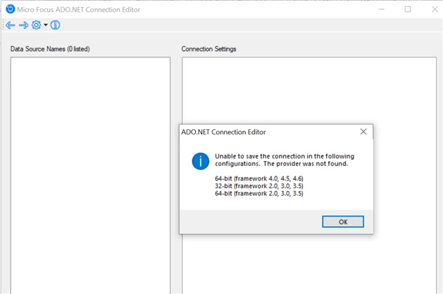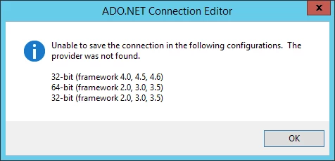 Installation of the ODAC drivers have been successful, however when trying to consume the drivers using ADO.NET Connect Editor I endup with dependency on Microsoft .Net framework 3.5 or lower where as the ODAC provider is .Net 4.5 and above and I've selected Framework as 4.0 and above in ADO.Net and the CPU architecture as 64 bit.