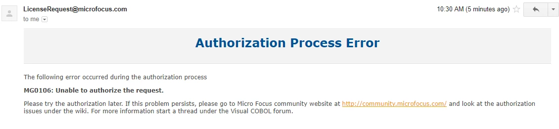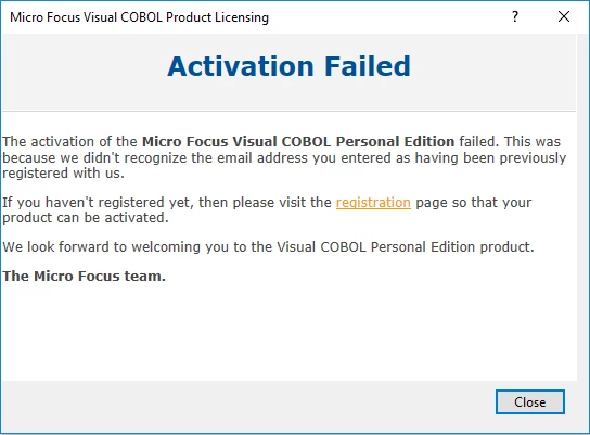 Hello, I have Visual Studio 2017 Community edition installed on my computer and registered on the Micro Focus website to download Visual COBOL. However, I cannot get the license activation to work. I've tried this multiple times and still get the same errors.