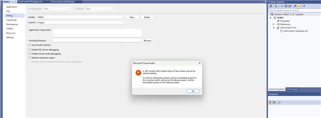 I created a new project under the following platform: Windows Forms Control Library(.NET Framework). It comes with a template code. I want to run the application before I add any new code but I encounter the following error: "A .NET project with Output Type Class Library cannot be started correctly. In order to debug this project, add an executable project to this solution which references the library project. Set the executable project as the startup project "