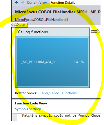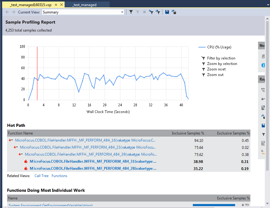 The Visual Studio Profiler can also be used to analyse Native code running within a managed Code Solution, but the profiler report is not as clear or easy to understand as many of the section names used in the Cobol Source are converted to internal .NET type names.
