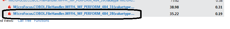 5. This view shows a high-level overview of the application. The next actions to take would be to select the components of the application to understand more about (profiling). For example, to understand which part of the application takes a long time to complete look at the Inclusive samples column, The screenshot below shows that the Micro Focus Cobol File handler component took roughly 35 % of the total time the application took to complete: