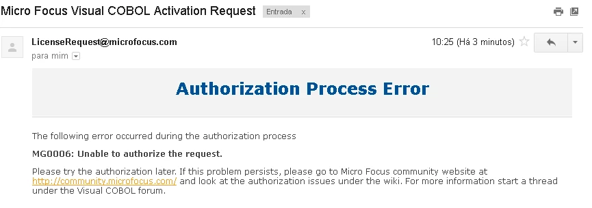 Hello, My name Lucas Campos I'm student at Fatec in Brazil and I've some problem with authentication license, I already tried used automatic and manual but both have problem "MG00006: Unable to authorize the request", I try send the email too, but nothing. What did I do wrong ?