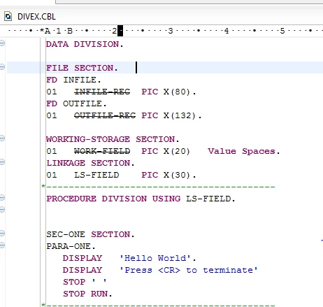 6. You will notice that some data items in data division are crossed out. That is because they are not referenced directly in procedure division. Be careful though. Don't be tempted to remove these data items from your code without being sure. If the data item is inside a copy file, then other program may be using them.