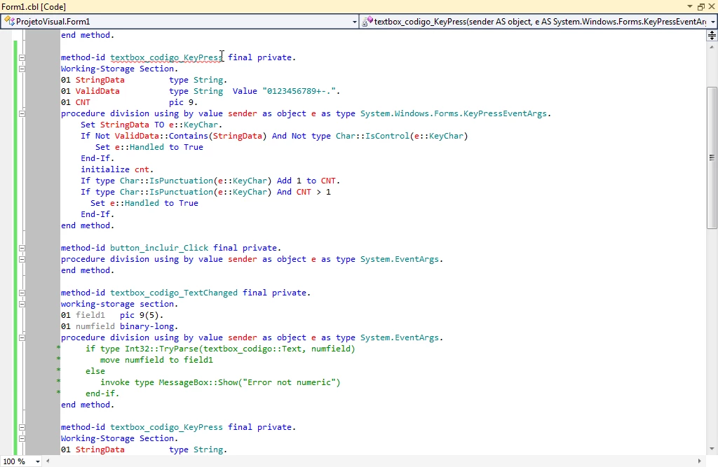 Error 1 COBCH0842 : Class member 'textbox_codigo_KeyPress' has multiple definitions with same signature