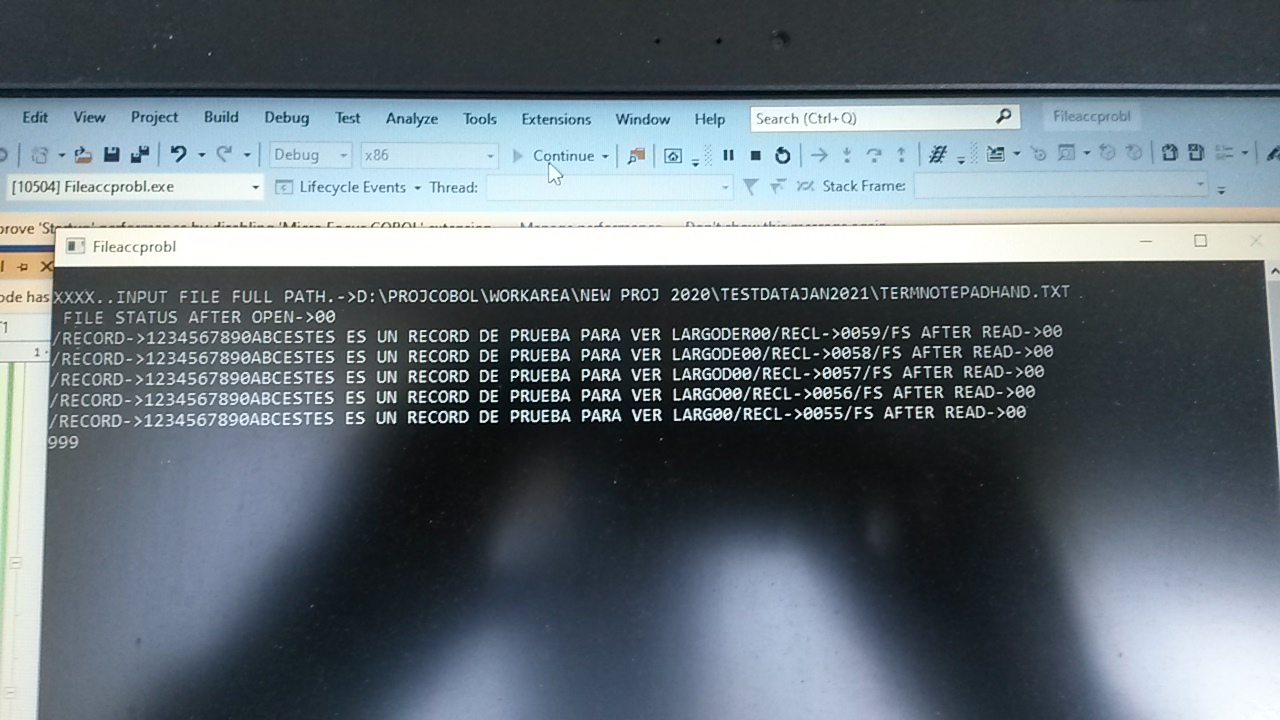 Input file to another file, with the same result. No matter what input file I use, the displayed data is the same!! Additionally, I created with another program a Seq,, Var Rec. file and used it as Input File and the result is the same: same data content displayed. I am using: W10, VS COBOL, Visual studio 2019, the input file is a file created using Notepad (line seq., var record). The very same code runs perfectly under OpenCobolIDE. Really I do no understand it all. Regards.