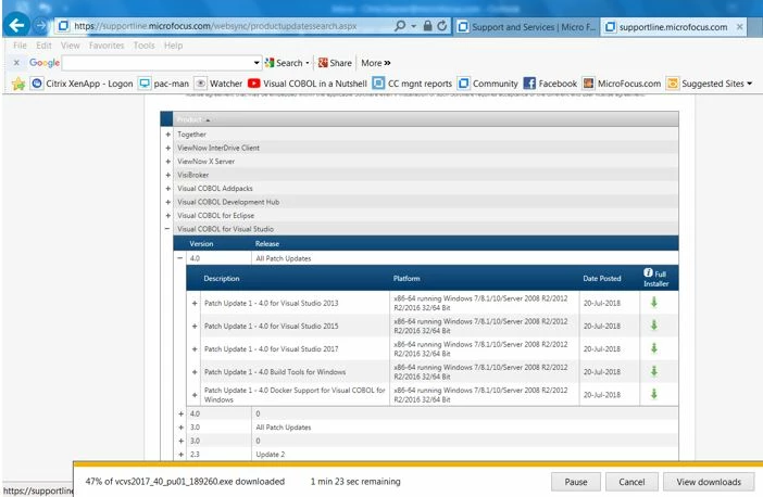 Yes, it was through the supportline.microfocus.com site. I click on "Product Updates" then "Search all updates available to you", click "Find Updates", check the box, click the plus next to "Visual COBOL for Visual Studio", click the plus next to "4.0 All Patch Updates", and then the down arrow next to "Patch Update 1 - 4.0 for Visual Studio 2017".