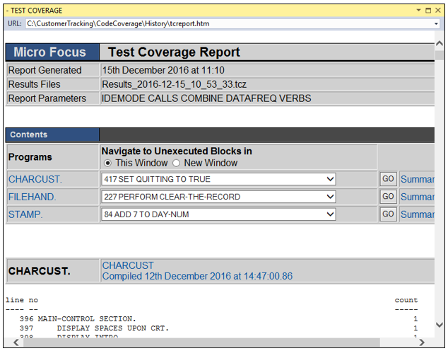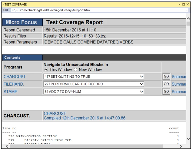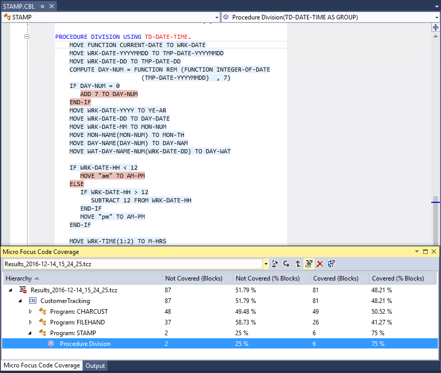 Running the application with code coverage will produce a Results.tcz file in the folder specified in Tools > Options > Micro Focus > Code Coverage > Results Options. This file provides statistics in the Micro Focus Code Coverage window and includes information about the percentage of the code that has been executed, as well using color to indicate areas of the code in the editor that have been executed or not executed. Code execution is logged for each program and sub-program. In addition HTML reports can be created from within the Micro Focus Code Coverage window. If the window is not visible, to display it click View > Micro Focus Code Coverage.