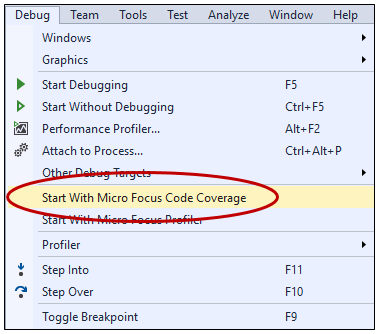- Rebuild the project to apply the changesThe application can now be run in code coverage mode by selecting Debug > Start With Micro Focus Code Coverage.