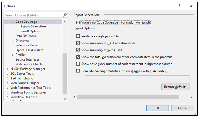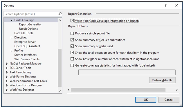 Visual COBOL provides support for code coverage of native COBOL applications directly from within the IDE. In order to produce reports, code coverage needs to be enabled within a project's properties, programs need to be compiled and run with code coverage to produce the relevant reports.