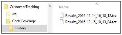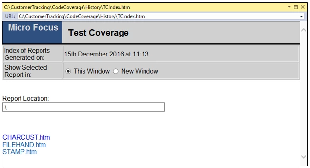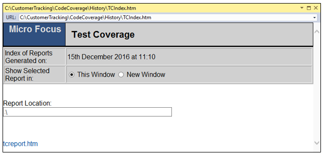 The history of running the application with code coverage is saved in a History subfolder in the location of the Results.tcz file. The results from previous runs with code coverage can be loaded into the Micro Focus Code Coverage window (see below).