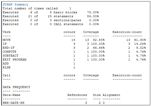 The report includes a summary of the percentage of statements, Call statements, blocks etc. that have been executed in the program: