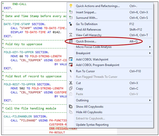 Right click to invoke the context menu after placing the cursor on a section or paragraph name or data item etc.: