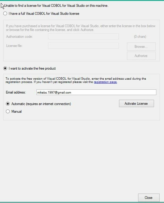 It's pretty simple. I open the program, attempt to use it by opening a COBOL program, or making one. It asks me to license the program. I can do it automatically be entering the email I used to download it, which does not work. Or I can do it manually by sending some funky looking email which does not work either. Support told me to go to Help> Micro Focus Product Help> Product Licensing. Does not work either.