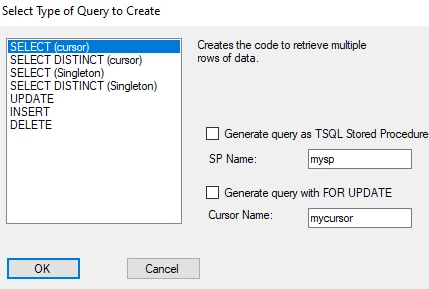 This will generate code which will define the cursor, open the cursor and then, in a loop, fetch all of the rows.