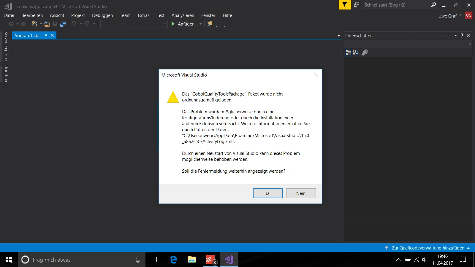 Following on from Paula's reply, it would be useful if you could provide the ActivityLog.xml created by Visual Studio to allow us to check the cause of the failure you saw. If you start Visual Studio from the Windows 10 search box ie where Frag mich etwas is displayed, by typing