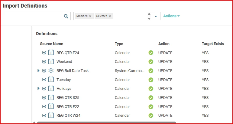 it's not clear to me what was updated, if a Zena definition (task process etc.) refers to a calendar and that calendar is updated it should be imported to be updated in the target environment as well as otherwise the scheduling criteria might be wrong, right now there is no way to exclude any object types from the import other than sorting on the type column and un-ticking the boxes for the objects (in your case calendars)