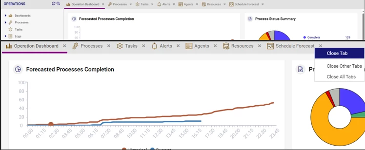 With multiple tabs, you have the option to rearrange tabs. As shown in the diagram below, you have the option to close tabs, close other tabs, or close all tabs. This capability is available in operations and authoring pane.